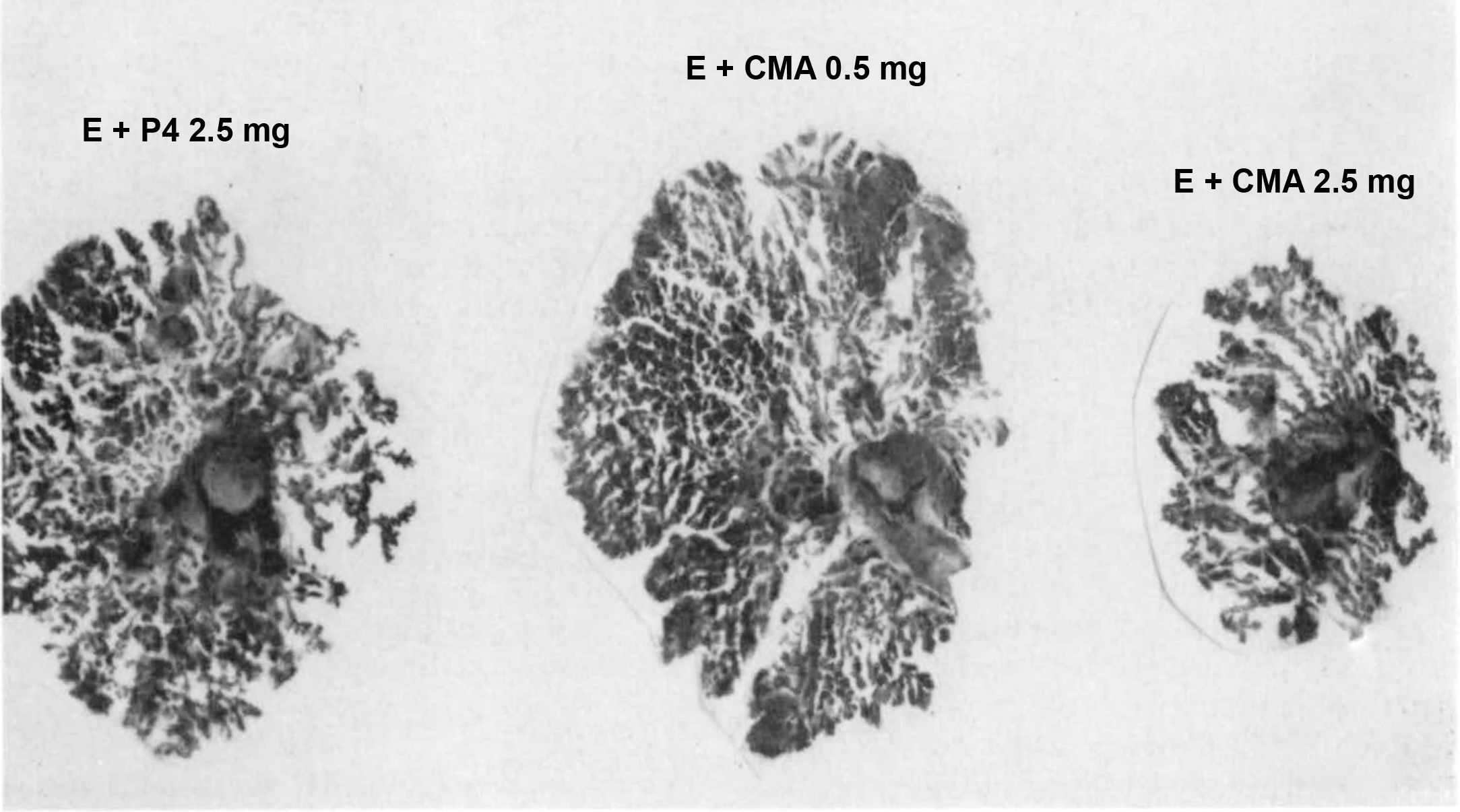 FIG. 1. Whole mounts of mammary glands showing development after diverse treatments: A) estrone (10 μg) plus 2 mg progesterone [E + P4 2.5 mg]; B) estrone (10 μg) plus 0.5 mg chlormadinone acetate [E + CMA 0.5 mg]; C) estrone (10 μg) plus 2.5 mg chlormadinone acetate [E + CMA 2.5 mg]. Note that the large dosage of chlormadinone acetate resulted in poor development of the ductal system.