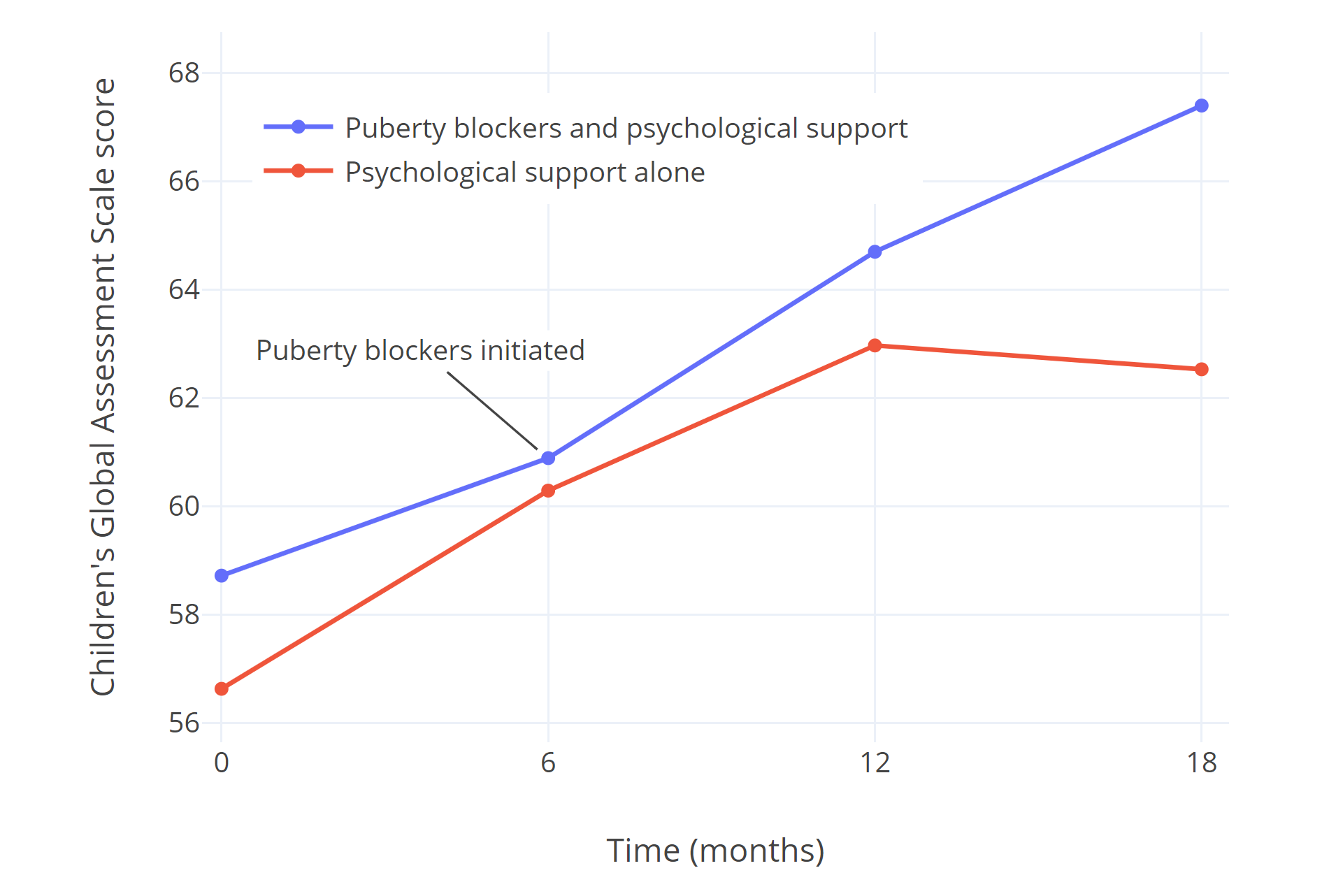 Costa et al. (2015) studied 201 gender dysphoric adolescents who presented at the British Tavistock and Portman NHS Gender Identity Development Service. Of them, half were considered eligible for puberty blockers immediately, receiving them in addition to psychological support. The other half were not considered immediately eligible for puberty blockers, citing reasons such as psychiatric problems or conflicts with parents and siblings. These patients received only psychological support for the following 18 months. All patients’ global psychological functioning was assessed using the CGAS questionnaire. Both groups showed significantly improved psychological functioning with psychological support, but the group receiving only psychological support stalled and showed no further improvement towards the end of the study, while those receiving puberty blockers continued to show greater improvement. The authors point out that the eventual CGAS score of the group receiving puberty blockers coincided almost perfectly with those found in a sample of children/adolescents without observed psychological/psychiatric symptoms.