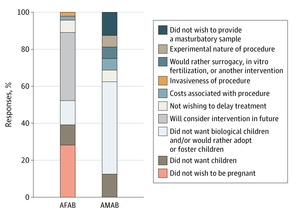 Regardless of this, transgender individuals are extremely unlikely to use fertility preservation, with some estimates suggesting utilisation rates below 5% in North America (Chen et al., 2017; Nahata et al., 2017). In one piece of research, Pang et al. (2020) questioned 102 transgender Australian teens on their reasons for declining fertility preservation. The following statistics were gathered: