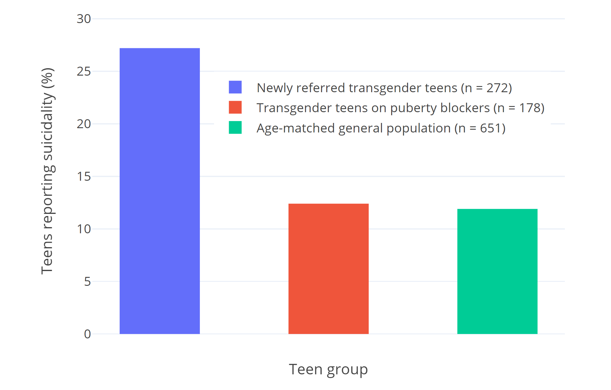 Figure 2: Percentages of teens who report suicidality in van der Miesen et al. (2020). Suicidality was defined as endorsing the statement “I deliberately try to hurt or kill myself” or “I think about killing myself.” Suicidality among Dutch transgender youth has not significantly changed over time, making cohort differences unlikely (Arnoldussen et al., 2020).